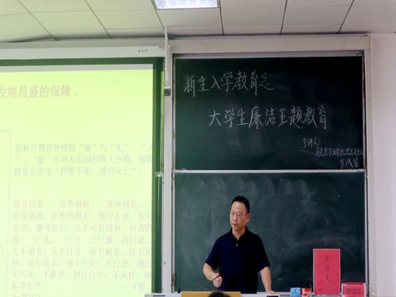 本网讯(通讯员 谭瑞秋/文 王婵媛/图)9月8日下午,我院在德智楼9B210教室开展2021级新生入学教育之大学生廉洁主题教育。我院党总支书记罗成富受邀出席并担任主讲人,大一全体学生参与此次活动。