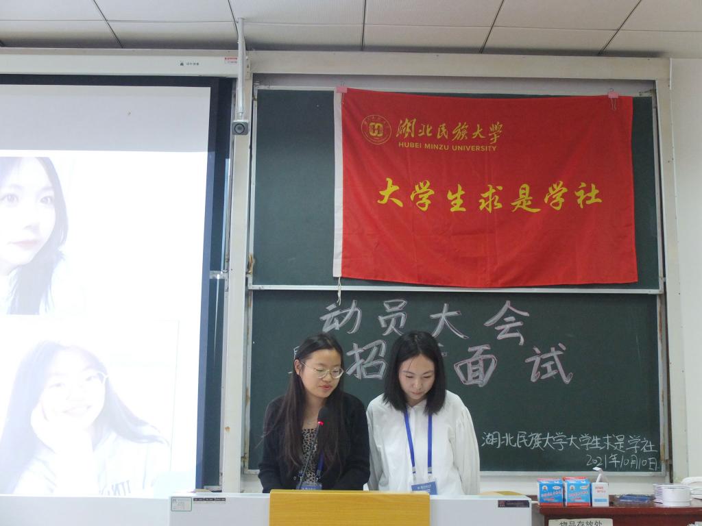 活动伊始,主持人对新加入社团的会员表示热烈欢迎,并简要介绍大学生求是学社历史发展等基本情况。紧接着,各部门负责人分别对部门工作进行宣传介绍。随后,社团工作人员分发干事招新登记表,组织招新面试活动。此次面试在社团办公室进行,应试者积极踊跃,面试活动顺利完成。