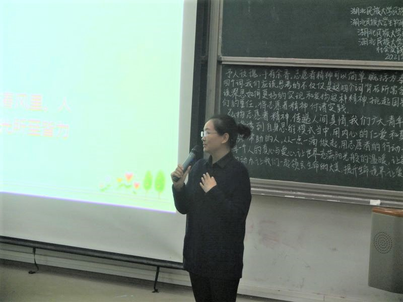 本网讯(通讯员 王婵媛 见习通讯员 吴梦/文 向爱萍/图)10月22日晚,我院联合美术与设计学院、生物科学与技术学院、民族学与社会学学院在修远楼5B404教室举办青年志愿者培训交流大会。恩施市义工协会会长谭鸿应邀出席并担任主讲人。四院全体志愿者参加此次培训交流大会。