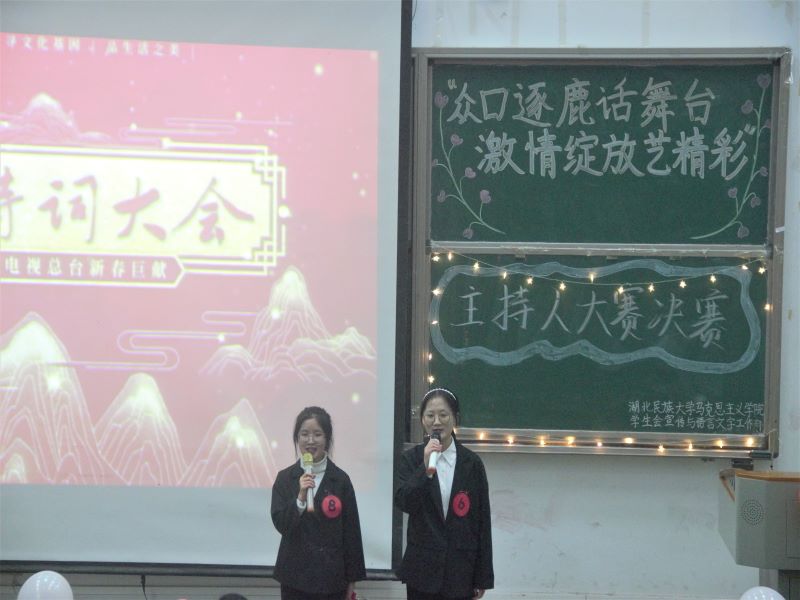 本网讯(通讯员 王婵媛 见习通讯员 赵光荣 秦瑶/文 向爱萍 孙航/图)11月30日晚,我院在修远楼5B404教室举行以“众口逐鹿话舞台,激情绽放艺精彩”为主题的主持人大赛决赛。我院教师蔡诗敏和宋祖红应邀担任评委,大一大二学生到场观看。