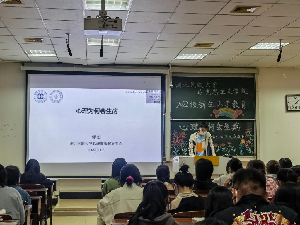 11月5日晚,我院于德智楼9B210教室开展以“心理为何会生病”为主题的心理健康教育活动。特邀我校心理健康教育中心教师邹松进行直播授课,我院全体大一学生参与此次活动。