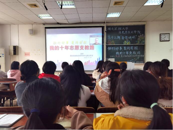 11月24日下午,以“但行好事、莫问前程:我的十年支教之路”为主题的第十三期“自信讲坛”于德智楼9B210教室顺利举行。本次特邀第23届中国青年五四奖章获得者、最美基层高校毕业生、全国最美志愿者袁辉进行线上授课。我院学生科科长杨婷主持本次讲坛,大一、大三全体学生参与。