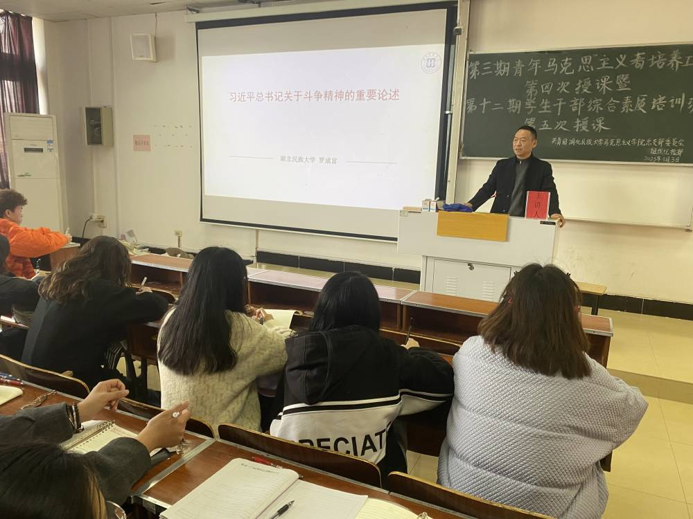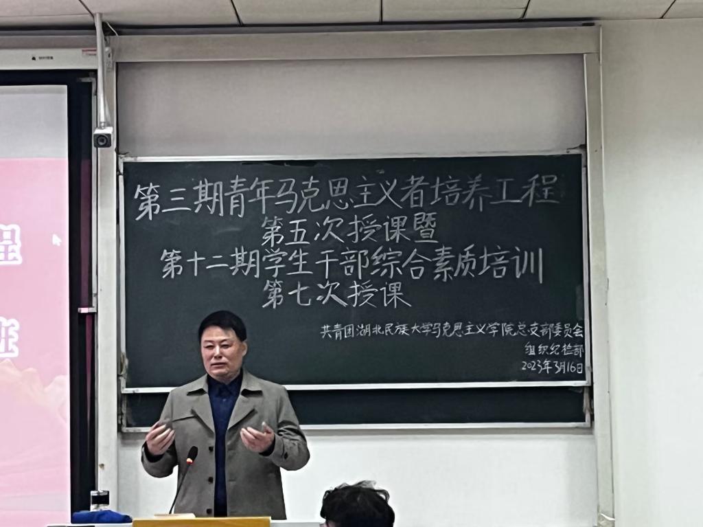 2月22日,我院在德智楼9B210教室开展集中影像授课,通过观看电影《革命者》,并撰写观影感悟;2月25日,在德智楼9B210教室开展以“坚定初心跟党走,砥砺奋进新时代”为主题的集中交流讨论; 3月3日,在德智楼9B210教室开展以“习近平总书记关于斗争精神的论述”为主题的第四次授课,由马克思主义学院党总支书记罗成富主讲; 3月16日,我院在德智楼9B210教室开展以“以奋斗的姿态激扬青春”为主题的第五次授课,由马克思主义学院院长徐铜柱主讲; 3月16日,在德智楼9B210教室开展以“抗日战争时期中国共产党在恩施的斗争”为主题的第六次授课,由马克思主义学院教师邱世兵主讲;3月20日,在五环体育场开展以“书香致远,墨卷至恒”为主题的户外实践活动。