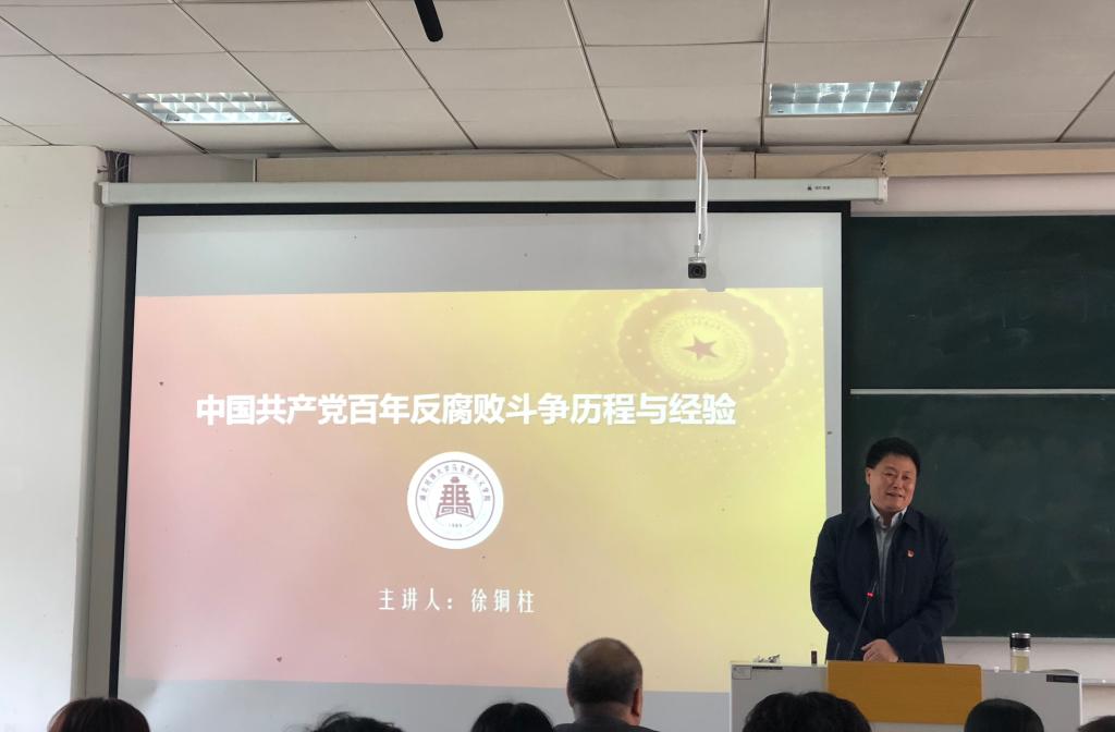 我院院长徐铜柱以《中国共产党百年反腐败斗争历程与经验》为题,分别从两个部分进行讲述,第一部分为“中国共产党百年反腐败的历史脉络”,将其分为四个时期进行阐述;第二部分为“中国共产党反腐败的基本经验”,总结了中国共产党百年反腐败斗争主要有八个方面的经验;最后,他强调中国共产党进行反腐败斗争主要是为了人民,为了维护人民的利益的。