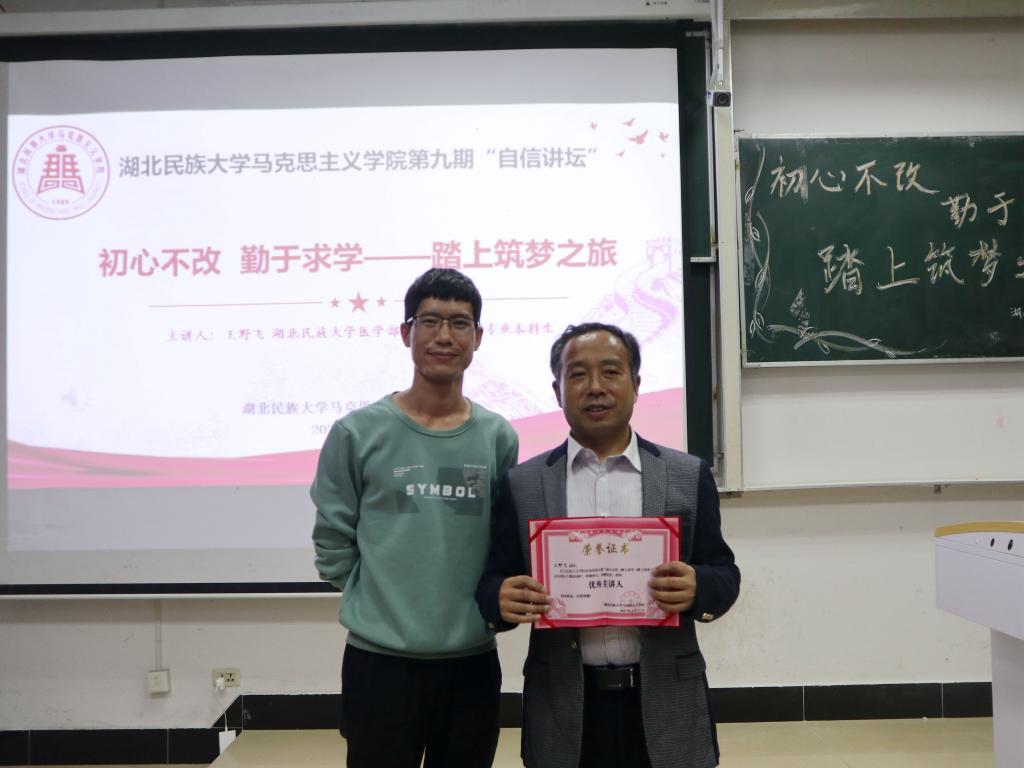 活动最后,毛召为王野飞颁发证书,授予他“优秀主讲人”称号并讲话,他认为王野飞的亲身经历对每个人来说都有启发性,希望在场学生静下心、认真思考,学会付出行动实现自己的梦想,实现自我价值和人生价值。
