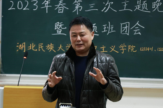 2月26日晚,我院于德智楼9B210教室开展 “青春践行二十大”——第三次主题晚点名暨主题班团会。学校党委副书记邓磊,学生工作处副处长李建华,马克思主义学院党总支书记罗成富、院长徐铜柱、副书记张明波、思想政治教育系副主任刘磊、班主任崔应美应邀参加本次活动,1222401、1222402支部全体学生参与。