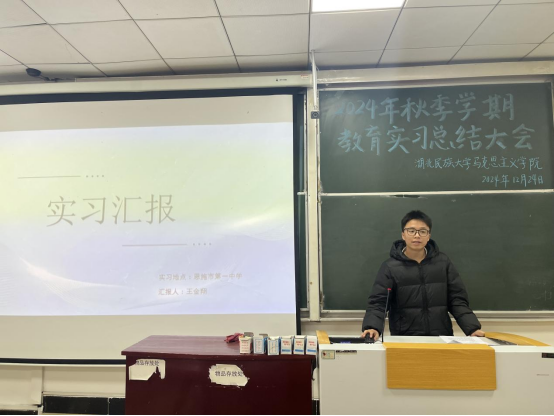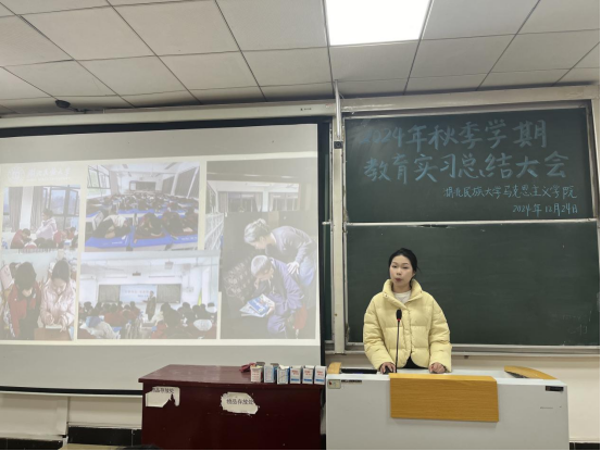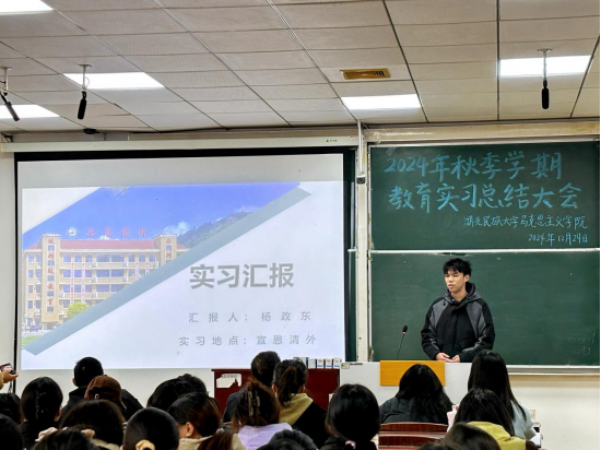 12月24日下午,我院在德智楼9B210教室召开2024年秋季学期教育实习总结大会。我院副院长张胥,思想政治教育系主任梁舒,实习带队老师张少玲参与此次会议。会议由教学科科长兰洁主持,大三、大四全体学生参加此次大会。