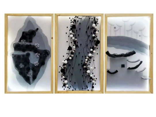 作品以装饰画为表现形式,安徽古村落作为主要设计元素,将村落的主要特色进行分析总结,提炼出建筑形态,雕刻装饰,村落水系三个点作为设计元素。参考中国传统山水墨画的颜色和意境传达方式,进行创新材料创新形式的表达。