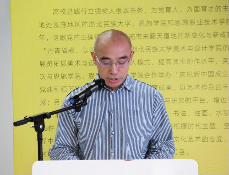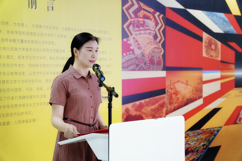 恩施州文联专职副主席张情讲话,她希望此次展览能够成为恩施州美术事业发展的又一个起点,也期待越来越多的青年美术家们扎根人民、融入生活,创作出更多更好的美术作品。