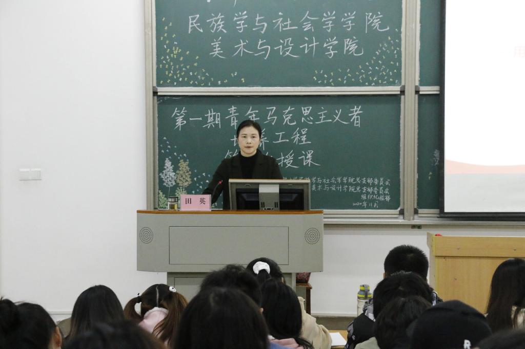 11月15日,美术与设计学院党总支书记田英,为美术与设计学院、民族学与社会学学院青年马克思主义者培养班全体学员讲授“习近平新时代中国特色社会主义思想”专题讲座。