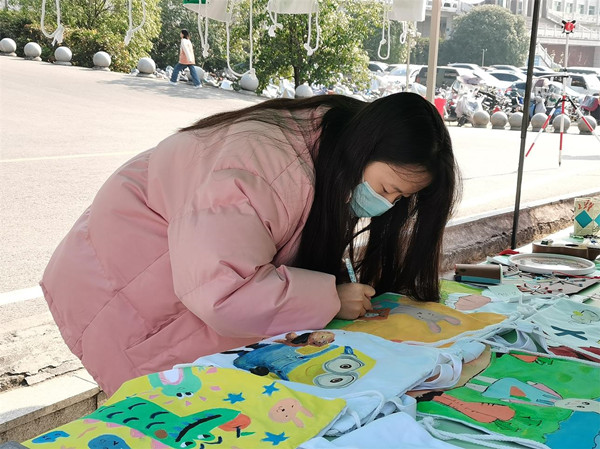 4日上午8:30线下手工义卖活动正式开始。活动现场手工艺品摆放整齐,琳琅满目。所有手工艺品皆出于学生之手,有自制书签、纸笔筒、卡通绘画帆布包学习用品,也有编织手链、古风提灯、手工画等艺术品。独具特色的手工艺品吸引了一批又一批大学生前来驻足,连附近居民也闻讯赶来。志愿者们积极热情地介绍手工艺品背后的细节,在宣传手工艺品的过程中也传递出奉献、友爱、善良、互助的美好品质。许多精美的手工艺品一经摆出便得到学生群体的青睐,现场热闹非凡。