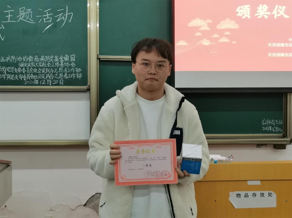 颁奖仪式在主持人的致辞声中拉开序幕。随后活动负责人对艾滋病日宣传活动短视频及艾滋病普及手册获奖选手颁发荣誉证书与礼品。在短视频大赛的颁奖环节中,“完美派对”、“超有‘艾’”团队荣获三等奖;”看见‘艾’”、“颜值爆表”团队荣获二等奖;“为‘艾’而行”团队荣获一等奖。随后的防疫宣传手册颁奖环节中,1621402支部的刘美琳、张沐婷,1219402支部的张璇夺得三等奖;1620402支部的肖胜萱、1621402支部的陈诺夺得二等奖;1621402支部的蒲泓宇夺得一等奖。