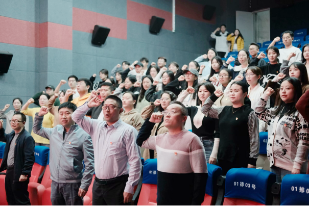 活动伊始,学院党总支书记曹召胜同志引领全体党员重温入党誓词。铿锵有力的誓言在影院内回荡,彰显出共产党员的坚定信念与责任担当。
