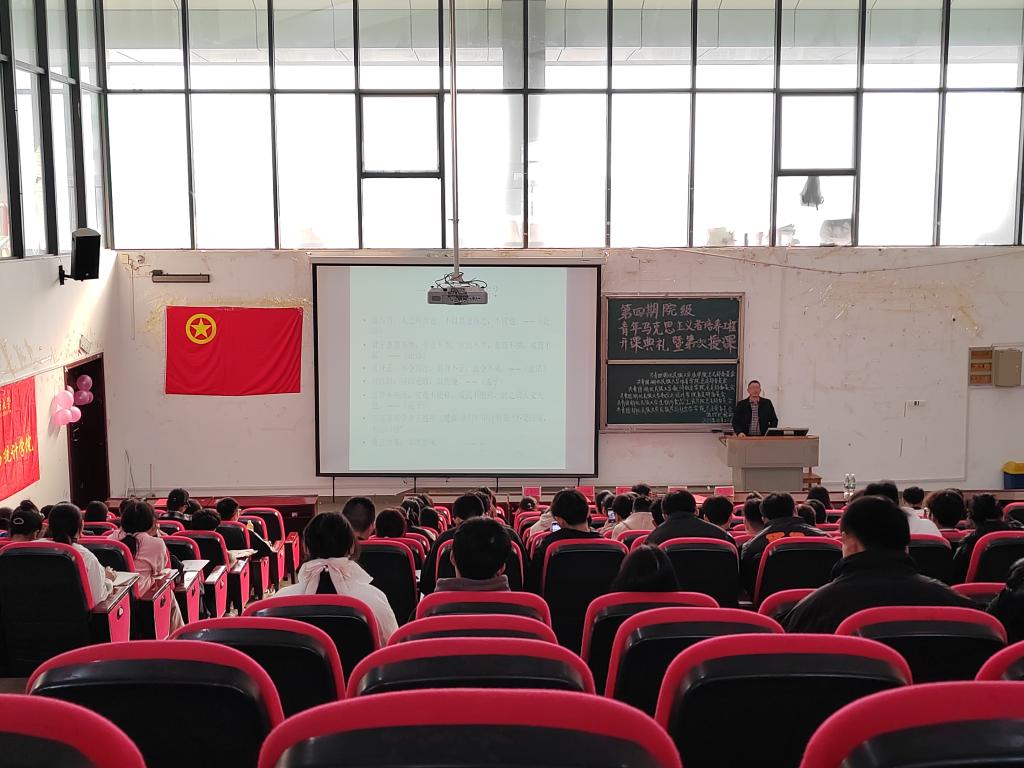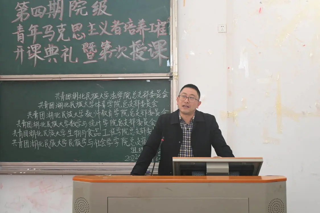 本网讯(记者 田露妍(见习)/文) 11月23日,由我院、法学院、体育学院、教师教育学院、数学与统计学院、生物与食品工程学院六院共同举办的第四期“青年马克思主义者培养工程”培训班开课典礼暨第一次授课在修远楼5B404教室举行。我院党总支书记曹召胜,法学院团总支书记谢学婧、教师教育学院团总支书记李志刚、生物与食品工程学院团总支书记张鑫媛、体育学院团总支书记黄昱勍受邀出席本次活动。