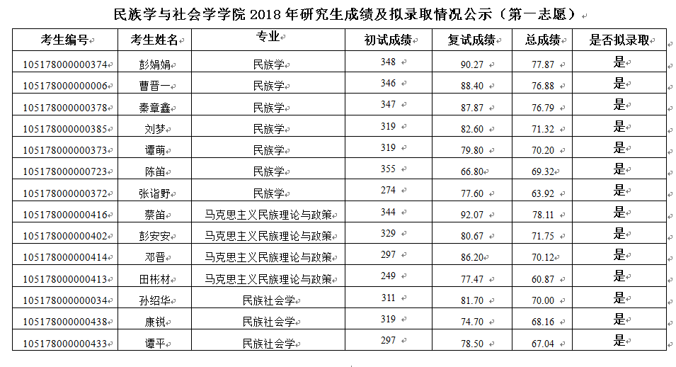 民族学与社会学学院2018年研究生成绩及拟录取情况公示(第一志愿)