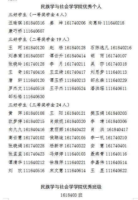 根据《开云电竞官方网站入口学生综合素质测评方案》、《开云电竞官方网站入口学生奖学金评定及奖励办法》、《开云电竞官方网站入口先进班级评选奖励办法》,在各班级民主测评、推荐的基础上,经学生科审核,报学院领导批准,现将民族学与社会学学院2018-2019学年优秀个人和优秀班集体名单公示如下,如对评选结果有异议者,请于9月29日下午17:30前将情况实名举报或反馈到民族学与社会学学院学生科张老师处(电话:18372556088,办公室:5B108)。