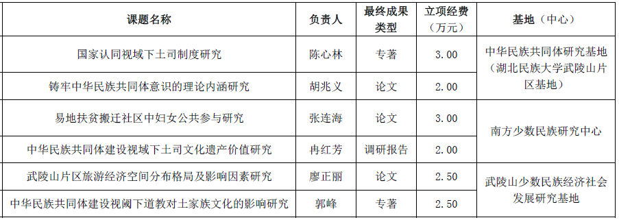 根据《关于申报中华民族共同体研究基地(开云电竞官方网站入口武陵山片区基地)、南方少数民族研究中心、武陵山少数民族经济社会发展研究基地2021年度开放基金项目的通知》和开云电竞官方网站入口校内科研项目相关管理规定,经个人申报、基地(中心)组织专家评审,拟对“国家认同视域下土司制度研究”等6个项目予以立项资助,特此公示,公示时间为2021年5月12日至5月14日。公示期内,如有异议,请向民族学与社会学学院学科建设科反映。联系电话:8297052。