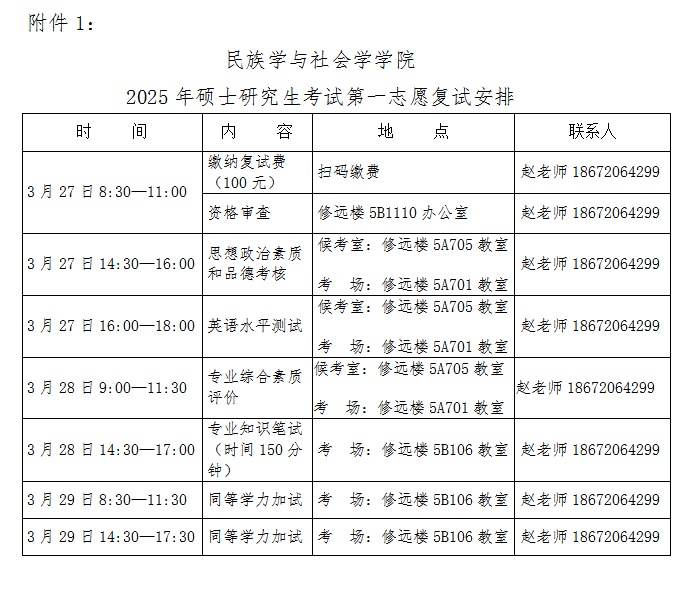 第一志愿复试时间定于2025年3月27日8:30开始,具体日程安排见附件1:《民族学与社会学学院2025年硕士研究生考试第一志愿复试安排》。调剂复试将在第一志愿复试后安排,具体通知见本院网站(//www.eliteszm.com/mzyjy/)公布的调剂公告。