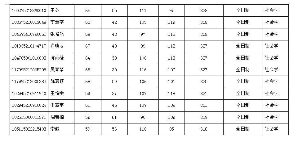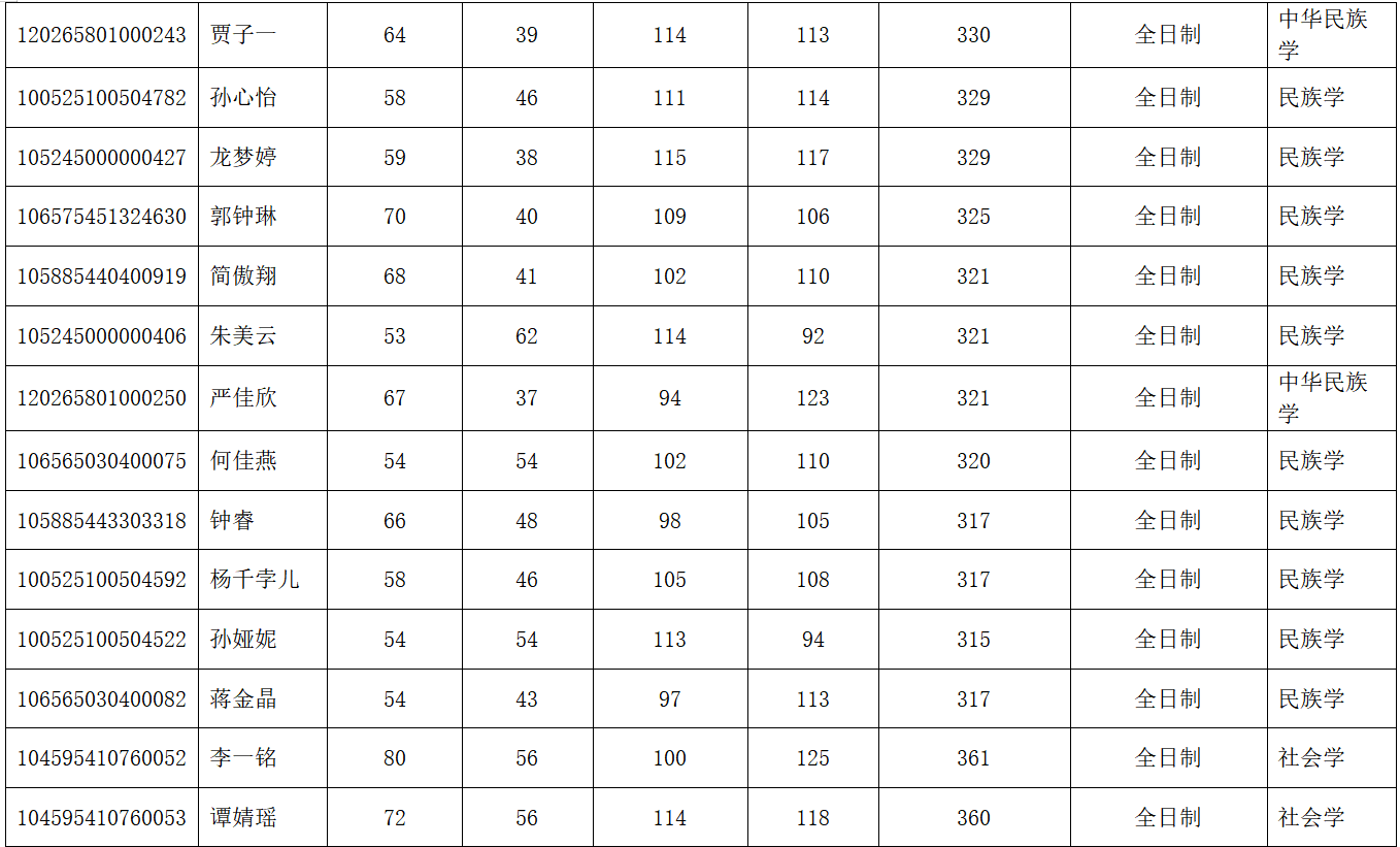 根据《民族学与社会学学院2025年硕士研究生招生调剂公告》,我院在2025年4月8日0时—4月8日14时开放调剂系统,根据考生初试专业与调入专业相同优先原则、相近专业依据相近程度依次遴选原则确定调剂复试考生。相同专业为“民族学”(0304)专业,相近专业及遴选顺序为“社会学”(0303)专业、“中国史”(0602)专业、“世界史”(0603)专业、“考古学”(0601)专业、“马克思主义理论”(0305)专业、“政治学”(0302)专业。确定初试专业的依据为专业代码前四位。在同一专业内,依据考生考试成绩排序,总成绩相同时以统考科目(政治、英语)总成绩排序。现将调剂考生进入复试名单公示如下: