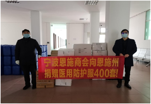 宁波恩施商会捐赠医用手套155000双、防护服400套、消毒液500桶、口罩5000个、医用口罩10000个、N95口罩2000个、KN90防尘口罩400个、护目镜7400个、消毒凝胶7个、消毒液28吨,宁波慈溪捐赠护目镜100个,上海湖北恩施商会捐赠防护服1300套。