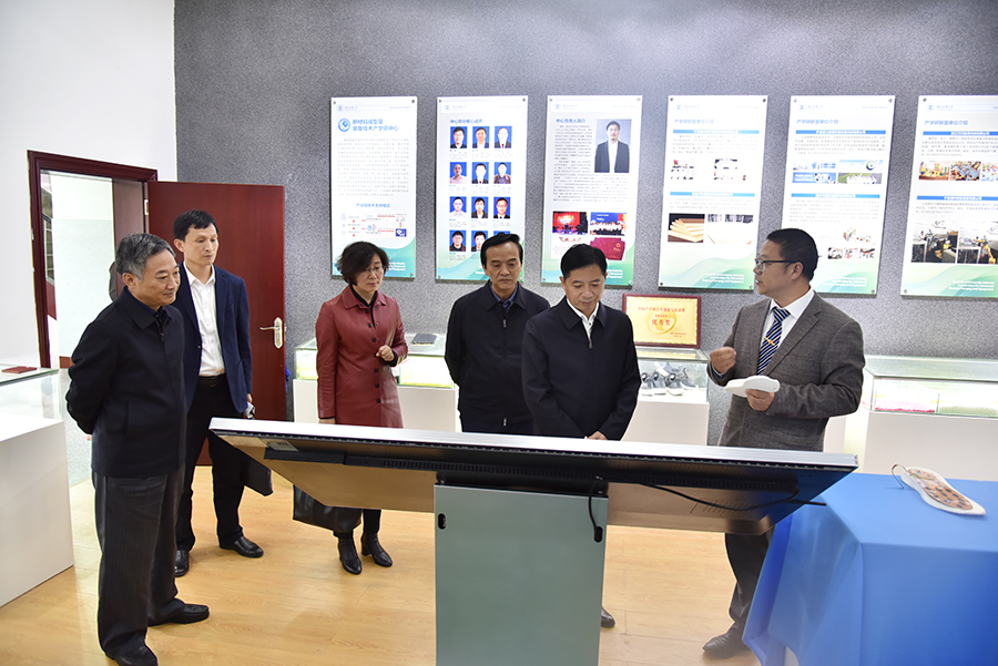 向前进(右三)、顿祖义(左一)陪同程幼金(右二)一行考察我校新材料成型及装备技术产学研中心