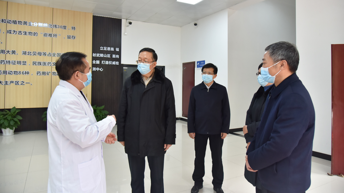 田学军(左二)在陶宏(左三)、顿祖义(右一)等陪同下考察武陵山中药材检验检测中心