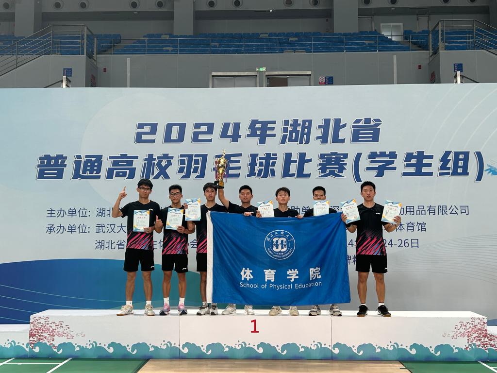2024年5月24日-26日,湖北省普通高等学校学生组羽毛球比赛(学生组)在武汉大学卓尔体育馆举行。本次比赛汇聚全省95所高校1346名运动员,我校由张辉、周一系两名教师担任教练员带领21名运动员参赛,经过努力拼搏,我校荣获男子丙B组(体育院校组)团体季军;谭朕(研究生)、张然摘得丙B组男子双打冠军;向石天(研究生)、赵雕;杨飞、岑雪莲分别闯入丙B组男子双打、混合双打16强。