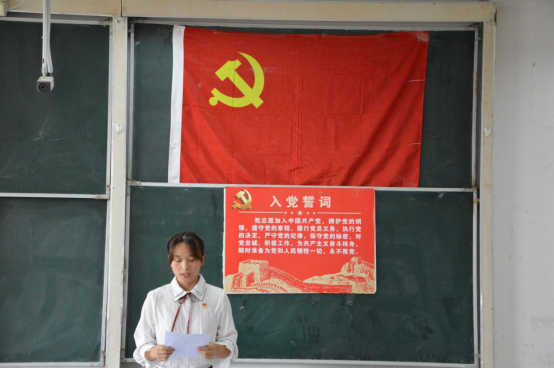 会议伊始,主持人讲述会议两个议程,议程第一项,预备党员起立,宣读入党誓词,宣誓完毕。
