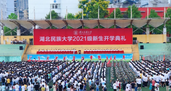 (伴随着嘹亮的国歌声,2021级新生开学典礼拉开序幕。)
