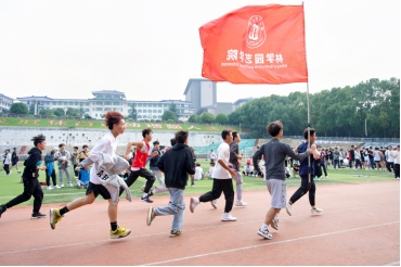 发令枪响,竞技组和教工组的运动员们奋勇争先,朝着终点的方向努力奔跑。各学院体验组也紧随其后,旗手们用力挥舞着旗帜展示着他们蓬勃的朝气。