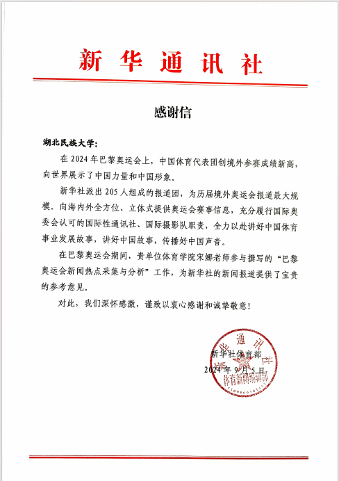 近日,开云电竞官方网站入口收到新华通讯社《感谢信》,旨在感谢体育学院宋娜老师在2024年巴黎奥运会上参与新闻热点采集与分析,以专业见解为体育代表团提供了重要参考,助力代表团在境外赛事中取得优异成绩。习近平总书记指出,2024年巴黎奥运会中国体育代表团的优异成绩,生动诠释了新时代中国精神,是广大运动员、教练员和体育工作者共同努力的完美答卷。