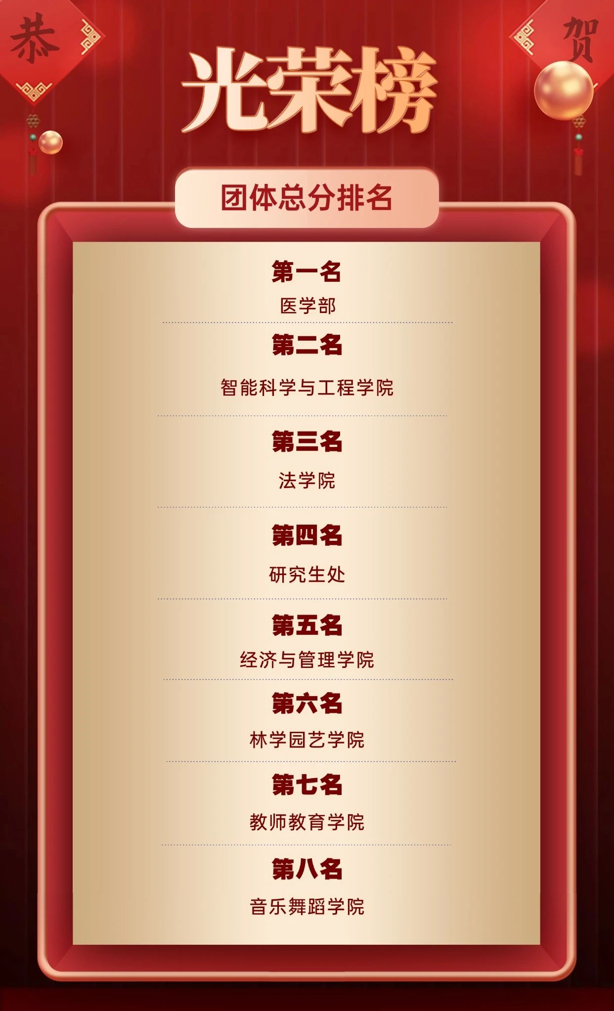本届运动会总裁判长、体育学院院长何斌宣布本届运动会团体总分排名及获得“体育道德风尚奖”的单位。医学部以650分的优异成绩位居团体总分榜首,智能科学与工程学院、法学院、研究生处、经济与管理学院、林学园艺学院、教师教育学院、音乐舞蹈学院分别位列第二至第八名。另外,民族学与社会学学院、马克思主义学院等十个代表队荣获“体育道德风尚奖”。