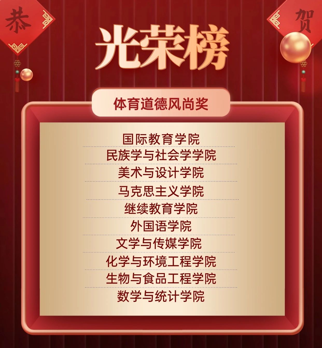 学校党委委员、党委宣传部常务副部长罗翔宇宣布本届运动会宣传工作奖获奖名单。文学与传媒学院荣获宣传工作一等奖,化学与环境工程学院、马克思主义学院、法学院获得二等奖,数学与统计学院、教师教育学院、生物与食品工程学院、医学部、体育学院获得三等奖。