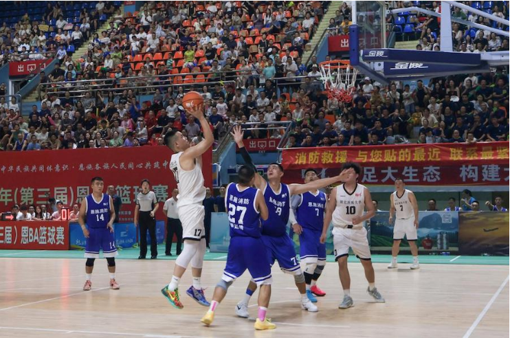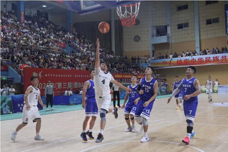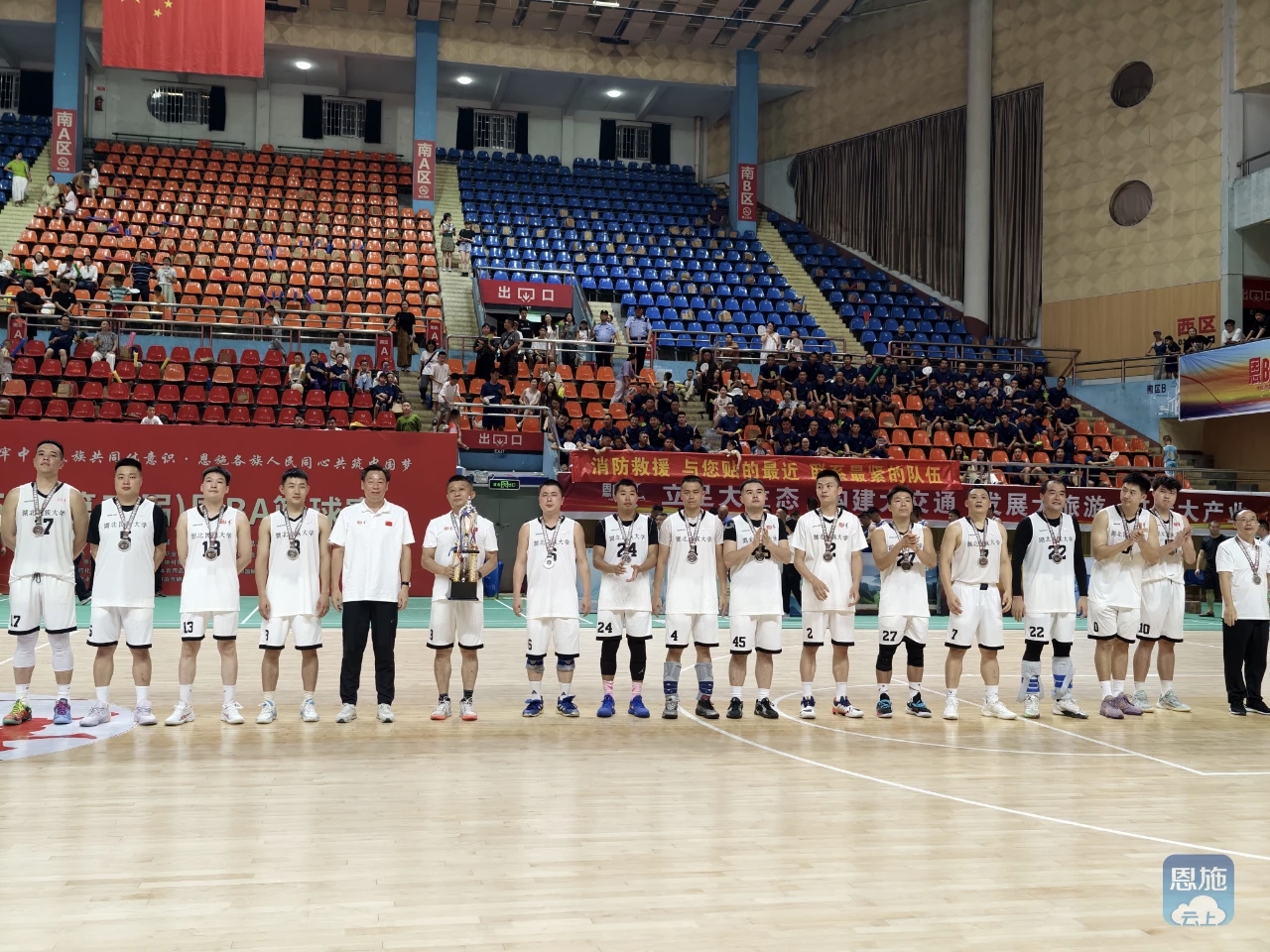由恩施州文旅局、州委统战部、州委宣传部、恩施州人大教科文卫委、州总工会、州民宗委等单位联合主办的2025年“‘恩BA’篮球赛”州直分赛区篮球赛自8月11日起火热开赛。此次比赛受到学校领导高度重视和紧密部署,在学校党委常委、统战部长田景福同志的带领下,体育学院牵头开展球员选拔工作,与附属民大医院联合组建实力强劲的篮球队。学校工会与附属民大医院工会积极做好各项后勤保障工作。分赛区开赛以来,开云电竞官方网站入口代表队表现优异,一路过关斩将,高歌猛进,于8月27日与恩施州消防救援局会师决赛。双方在第三届恩BA篮球赛开幕式结束后展开州直职工组冠军争夺战,面对实力强劲的消防救援局,开云电竞官方网站入口代表队不畏强敌,顽强拼搏,荣获州直分赛区职工组亚军。