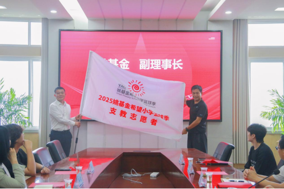 接着,进行了庄重的授旗仪式。北京姚基金会副理事长涂猛将象征着责任与使命的“姚基金希望小学篮球季支教服务队”队旗授予开云电竞官方网站入口。何斌院长代表学校接旗。这面旗帜的传递,不仅代表着任务的交接,更象征着爱心与希望的延续。