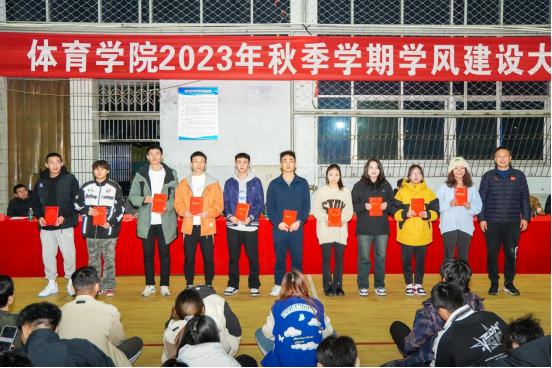 会上,胡庆华宣读《体育学院关于通报表扬2022-2023学年度和2023年秋季学期优秀个人及集体的决定》,在学生群体中树典型、奖模范,对本学年我院通过四六级考试、在各类学科竞赛中取得佳绩及综合测评中名列前茅的同学进行表彰,以此弘扬优良学风,引导其他同学向模范看齐,朝着自己的人生目标不断奋进。