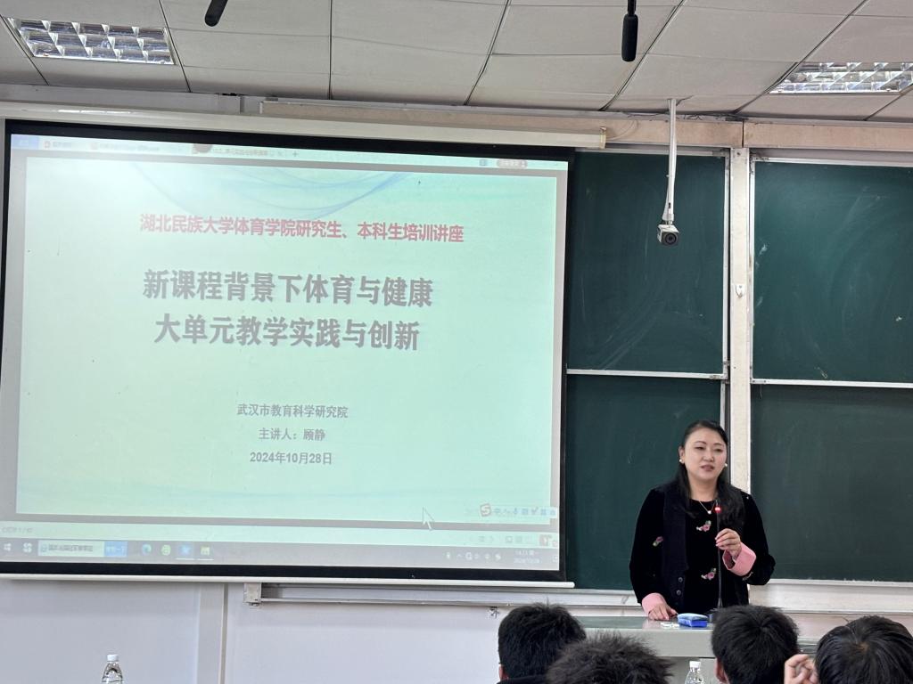 在新一轮基础教育课程改革背景下,为了进一步推动体育与健康教育的深度融合,提升教学实践的创新性,体育学院邀请湖北省特级教师、正高级教师顾静于10月28日14:30至17:30在德智楼9A211举办了一场主题为“新课程背景下体育与健康大单元教学实践与创新”专题讲座,深入探讨在新课程标准引领下体育与健康教学领域的新理念与新方法,并就如何在教学实践中实现创新与突破展开详细阐述,讲座由学院院长何斌主持。