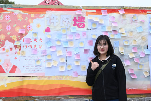 本网讯(记者 李美昊/文 见习记者 杨清密/图)3月11日,我院在大学生广场举办以“桃之夭夭,灼灼其华”为主题的女生节活动。活动分为“DIY石膏娃娃”“心想事成”“步步惊心”“知识闯关答题”四个环节。学生与心愿墙合影 “心想事成”环节,参与者在精美的便利贴上畅所欲言,写上祝福,表达参与者...