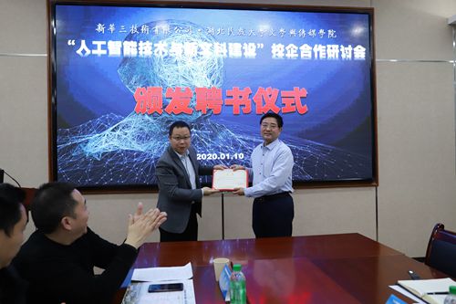 本网讯(见习记者 刘晓晴)1月10日,由文学与传媒学院和新华三技术有限公司联合主办“人工智能技术与新文科建设”校企合作研讨会在文传学院召开,学校党委常委、副校长邓磊教授出席会议并讲话。来自新华三技术有限公司、武汉大学和我校教务处、信息工程学院、音乐舞蹈学院的领导专家与文传学院全体教师共计80余人参加了研讨会。