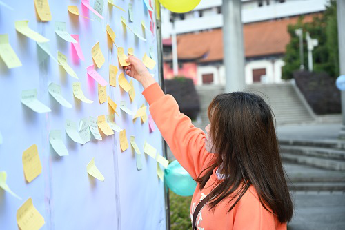 活动现场设有“游戏区”与“活动区”。游戏区设有“弹簧蹦蹦跳”“翻手为云”“让瓶盖飞”“瞪大双眼”四个游戏。“弹簧蹦蹦跳”需要参与者头戴弹簧,通过蹦跳的方式使其恢复原样,充分考验参与者的平衡能力;“瞪大双眼”即十五秒不眨眼问答,面对类型多样的题目,参与者时而苦思冥想,时而对答如流,在答题中增长知识,收获乐趣。活动区“星语星愿”环节,参与者在便利贴上写下对未来的憧憬和内心的感受,抒发自己的情绪;“请你跟我这样做”环节需要参与者学习展板上爬行式、莲花式、尸解式等解压小动作,参与者或动作标准,或肢体不协调,场外学生出谋划策,现场气氛热烈,吸引众多学生驻足。