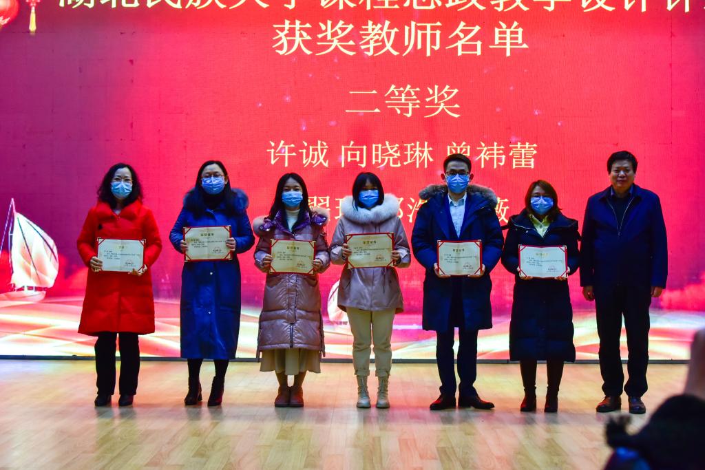 学校党委副书记、副校长汪兴平为二等奖选手颁奖。我院青年教师向萍、熊浚获得课程教学设计组二等奖,向晓琳获得课程思政教学设计组二等奖。