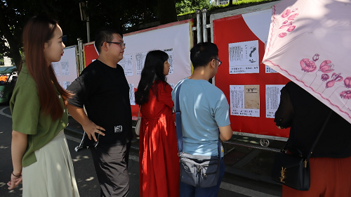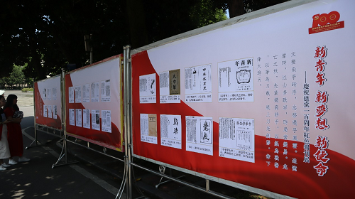 本次项目组共展出了二十四种从民国初年至抗日战争期间最具有代表性的红色报刊文献。每种文献展出内容为三部分:封面、代表作品和刊物简介。通过以醒目凝练的方式向广大师生宣传红色经典报刊文献,倡导呼吁广大当代新青年积极主动地深入学习党史,传承红色文化。展览期间吸引了师生的广泛关注,不少师生员工在展板前驻足观看。为了更好达到宣传效果,项目小组成员李楚、余欣遥、胡迈、唐浪清、唐桢坤、王静文等人还充当起了义务讲解员,在展览期间对前来观看的师生进行经典红色报刊讲解与宣传。