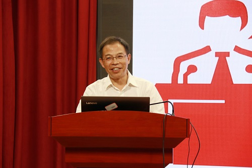 陈梦熊讲话。他引用毛泽东的“文明其精神,野蛮其体魄”激励新生能够在专业知识和良好教学氛围的熏陶下长足发展。(责任编辑 聂夏茸)