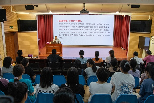 随后,张三夕教授围绕“敬业乐群”“守时守信”“严守学术规范”三方面展开讲述。他表示,"敬业乐群"意为专心修习学业,乐于与朋友同学切磋探讨,其有利于发展新型研究生同学关系;对于“守时守信”,他提到,时间是人生最重要的资源,人无信不立,国无信不兴,如今国家对失信人员追究得十分严厉,守时守信是每个人的立身之本;他着重讲述“严守学术规范”的重要性,对华中师范大学的《人文社会科学研究规范》及论文引用做的严格规定进行讲解,并通过举例子说明了学术不端行为带来的不良风气影响十分恶劣。最后,他呼吁在场的研究生走正路,坚持学术诚信,严守学术规范,树立良好学风,圆满地完成研究生学业,光明磊落地创造事业和人生的辉煌。