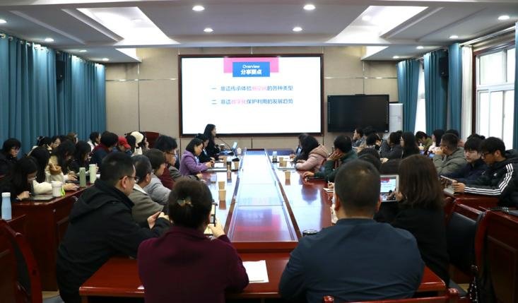 杨红教授以“南京绒花制作技艺”的成功传播为案例切入,分析了非遗融入现代生活的“变与不变”。随后重点从非遗传承体验新空间的类型,非遗数字化保护利用的发展趋势两个方面展开讲座。杨红教授结合国内外丰富的案例,视听结合、图文并茂,深入讲述了非遗的数字化保护与传承工作。