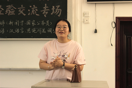 考公专场。2017级优秀毕业生张婷婷考取国家公务员,她从“明确自身需求”“合理制定目标”“掌握学习方法”“把握复习时间”四个方面分享自己的经验。她表示,备考前要结合自身情况正确选择岗位,做好规划,关注人民日报和学习强国等公众号,端正心态,勇敢尝试新鲜事物;2017级毕业生赵心语考上恩施州选调生,她从选调生的含义和条件、集中选调招录对象分享经验。在如何备考这个话题中,她从笔试和面试两个方面来分享自身经验,她提到,笔试要合理规划答题时间,正确选择每一个选项,面试则要把答题思维训练放在首位,跳出模版化答题怪图。