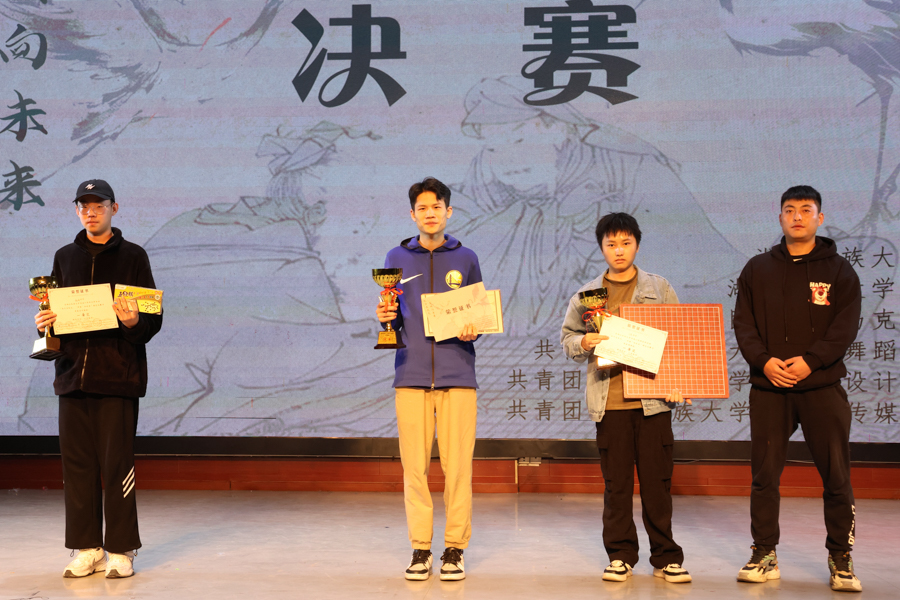 本网讯(记者 汪静柔 徐慧莹/文 通讯员 陆宇 刘光琦 记者 杨清密/图)11月18日,文学与传媒学院、体育学院、外国语学院、马克思主义学院、音乐舞蹈学院、美术与设计学院在音舞演播厅联合举办以“执子在民大,‘弈棋’向未来”为主题的棋艺大赛决赛。