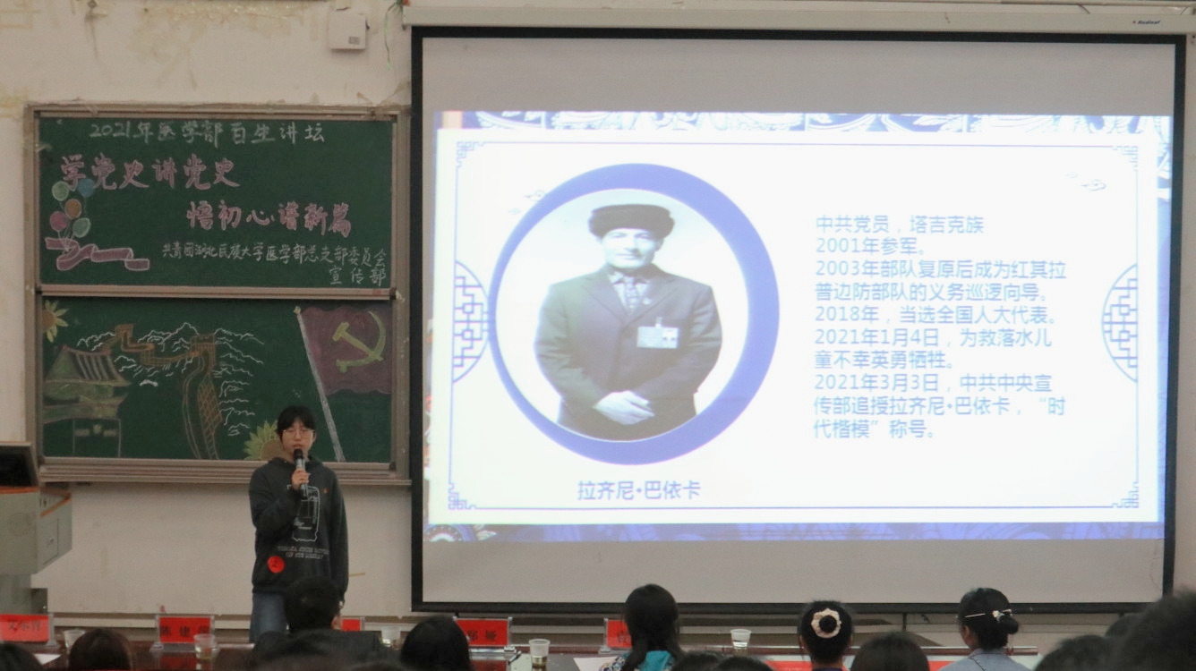 本网讯(记者 刘思 通讯员 杜泽鹏/文 摄影 张可欣 袁子涵 彭家乐/摄 )为学习习近平新时代中国特色社会主义思想,加强高校党史教育,4月24日,由医学部团总支宣传部举办的百生讲坛演讲比赛于修远楼5B403报告厅举行。医学部党委副书记黄晓波,医学部学生工作办公室郑娅、袁琳、陈建萍、艾尔肯·吾斯曼老师应邀担任评委,现场观众两百余名。
