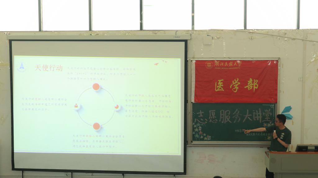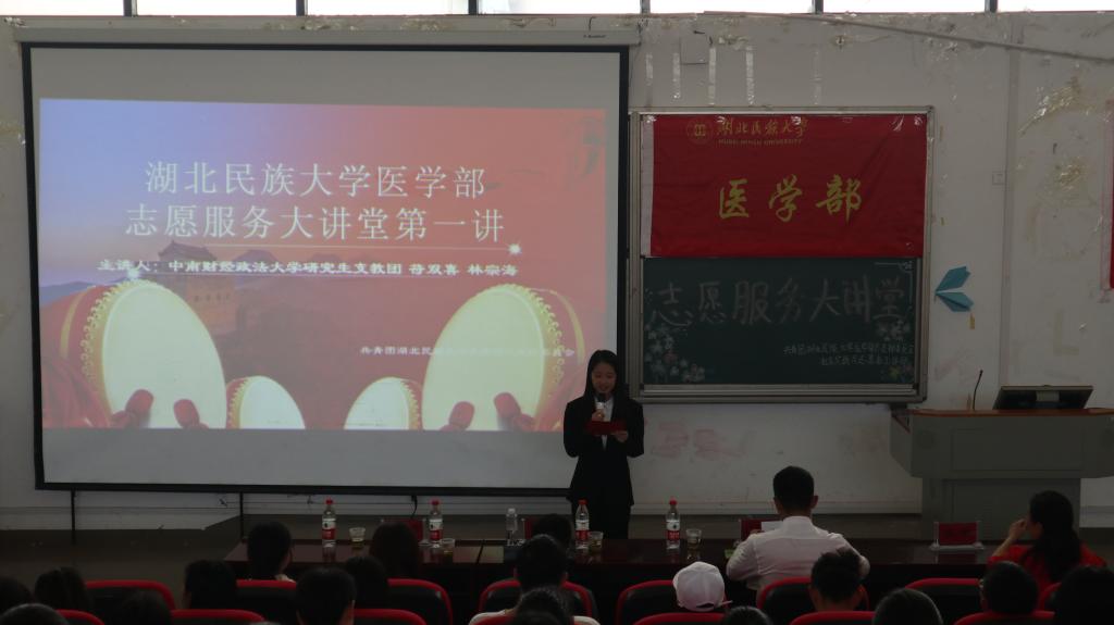 本网讯(通讯员 李湘 袁子涵/文 许旖蕾 曾凡轩/摄)为大力弘扬"奉献、友爱、互助、进步"的志愿精神,不断加强和完善医学部志愿服务体系建设,切实发挥志愿服务在学校发展和构建美好社区中的积极作用,6月5日,由医学部社会实践与志愿者工作部和青年志愿者协会联合开展的志愿服务大讲堂第一讲在修远楼5B404开讲。中南财经政法大学研究生支教团恩施分队队长符双喜、队员林宗海为主讲人。医学部学生办公室袁琳老师、陈建萍老师出席本次活动。现场同学100余人。