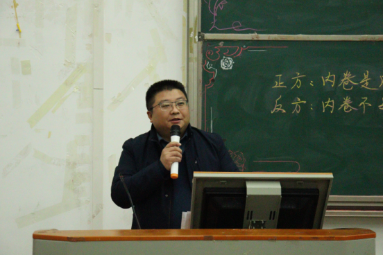 赛后,黄晓波对本次辩论赛进行总结,他首先对此次比赛及各位选手的表现予以肯定,并从自己的观点、观察和观感三个方面进行点评。他强调要理清“内卷化”现象衍生的逻辑,深入分析“内卷”形成的机理,正视非理性的“内卷”。